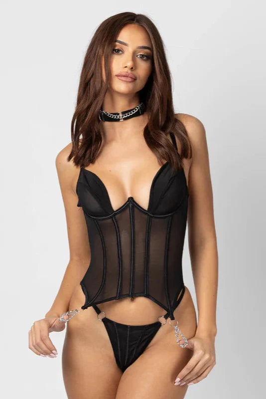 Embrace your bold side with the "Sultry Siren" set. This daring lingerie features a sheer corset design with a lace-up back, adjustable straps, and a matching choker for an extra touch of edge. Perfect for making a captivating statement.